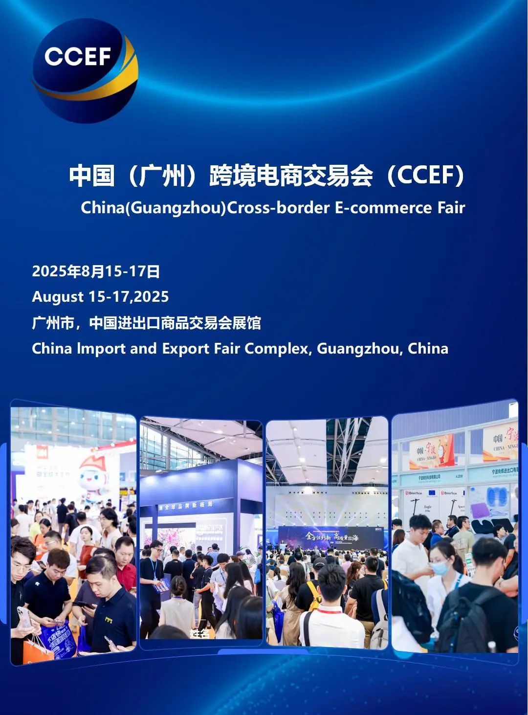 CCEF 2025 中国(广州)跨境电商交易会(CCEF) 指导单位:广东省商务厅 、广州市人民政府 主办单位:中国对外贸易中心集团有限公司 承办单位:中国对外贸易广州展览有限公司 时间:2025年8月15-17日 地点:广交会展馆